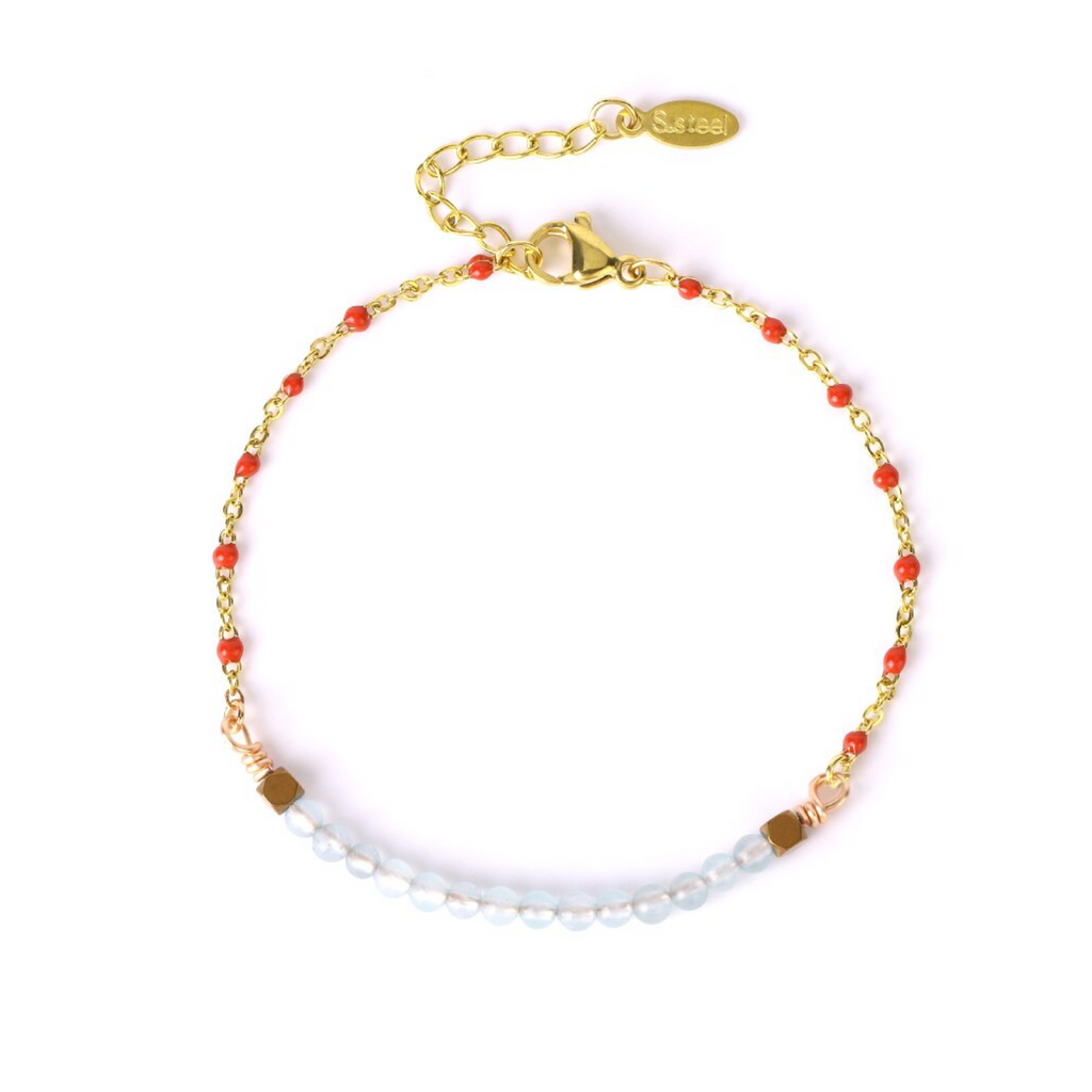 Apresentamos a nossa elegante pulseira com pérolas de água-marinha e detalhes em dourado! Esta pulseira é a forma perfeita de adicionar um toque de luxo ao seu visual do dia a dia. A pulseira apresenta belas pérolas de água-marinha. É ajustável para que possa encontrar o tamanho ideal e o fecho garante que se mantém segura no lugar.
