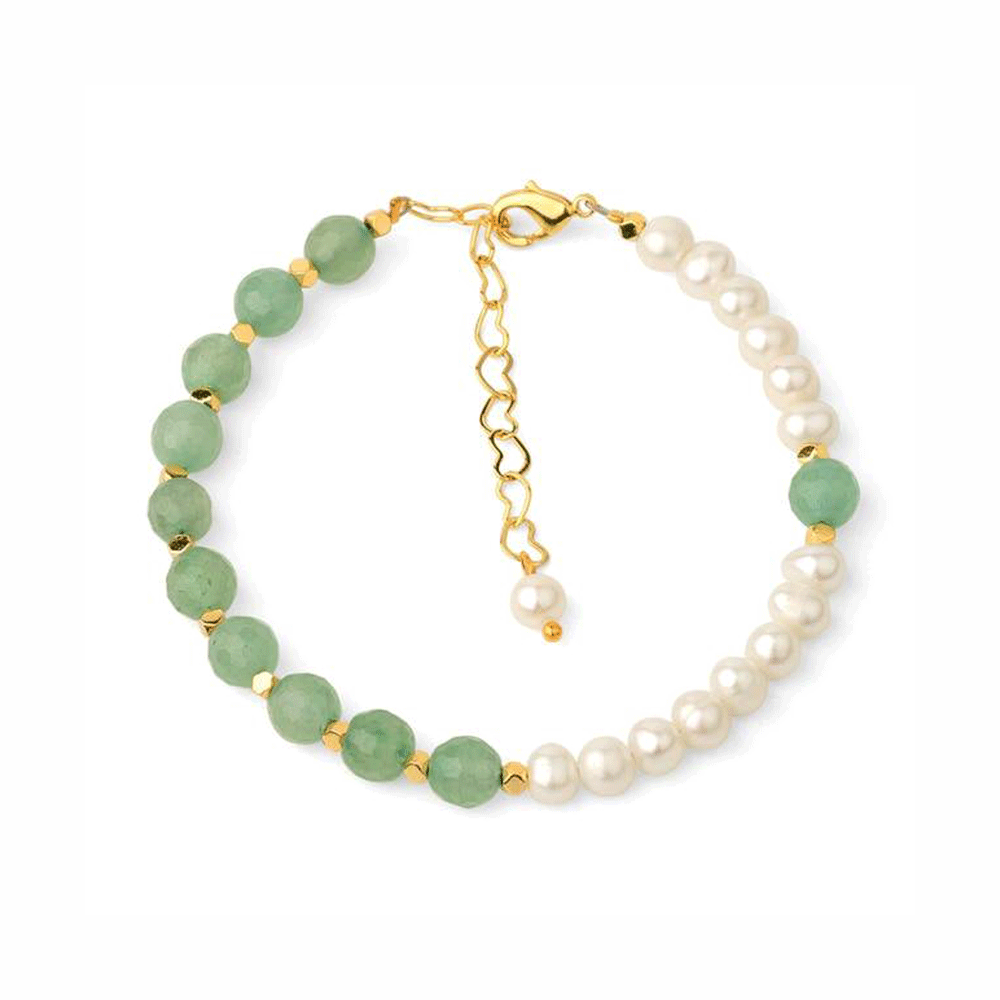 Esta linda pulseira feita de aventurina verde e pérolas brancas oferece-lhe proteção e boa vontade.