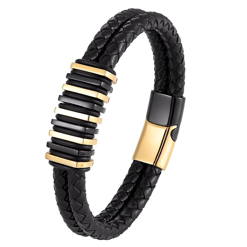 A pulseira masculina em couro preto e dourado seduz com o seu design artístico e é um acessório marcante para qualquer homem que deseje expressar o seu estilo de moda masculina. Este acessório de moda artístico combina o esplendor da cor dourada com a intemporalidade e elegância natural do preto, tendo tudo o que é necessário para atrair homens que querem destacar-se com a sua coleção de joias em couro.