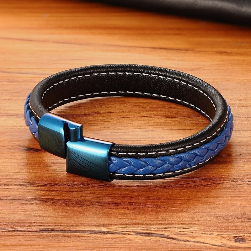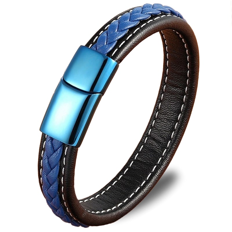 Vai adorar esta pulseira masculina em couro e aço azul.