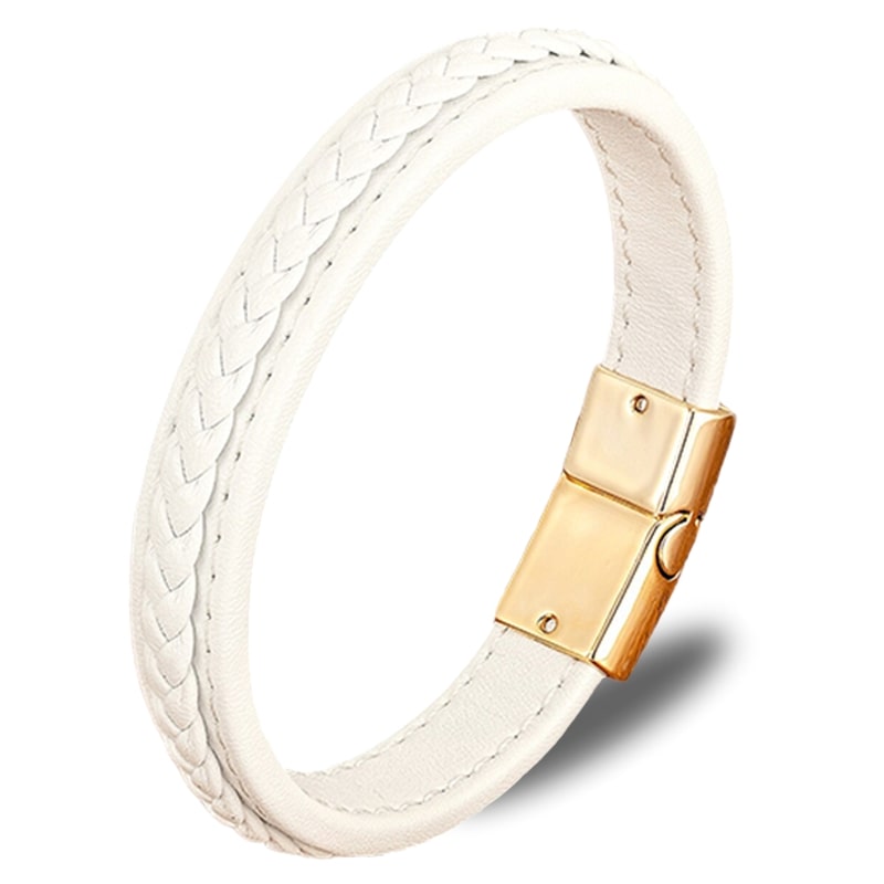 A nossa pulseira de couro branca para homem é um acessório elegante e moderno que acrescenta um toque de pura sofisticação a qualquer visual. Seja usada no quotidiano ou em ocasiões especiais, esta pulseira de couro branca é fácil de colocar e retirar graças ao fecho em aço inoxidável dourado, que combina perfeitamente com outras joias. A pulseira masculina em couro branco é um acessório verdadeiramente requintado que valoriza o visual e certamente será a peça que completa a tua coleção de joias.