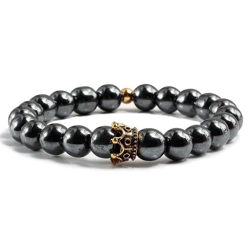 Pulseira de hematita preta feita de pedra de hematita 100% natural e pura. As principais características são a forma arredondada, o estilo antigo, a cor preta intensa e a superfície lisa.