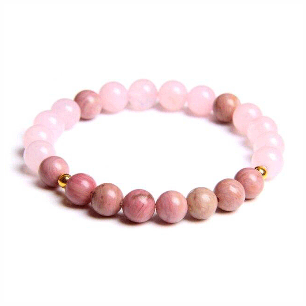 Esta pulseira de quartzo rosa & rodonita traz amor e paz para você. A pedra de quartzo rosa melhora a autoestima e acalma o stress emocional. A rodocrosita incentiva uma atitude positiva, criatividade e inovação, além de melhorar os estados de sonho.