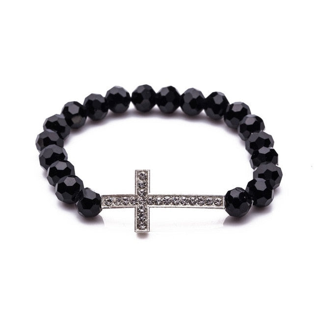 Deixe-se seduzir por esta pulseira cruzada de altíssima qualidade, com cordão elástico (ajusta-se perfeitamente a todos os pulsos). Cruz cristã decorada com strass de cristal e contas coloridas de fantasia. Use com estilo no pulso todo o amor e proteção de Cristo.