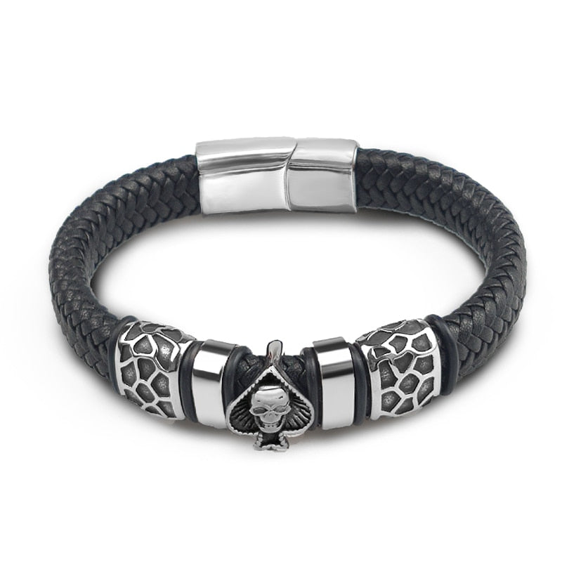 A pulseira gótica masculina é uma joia com caveira e ossos cruzados, adornada com o símbolo de espadas dos jogos de cartas. Esta pulseira está disponível em prata e preto, cores clássicas que combinam com uma grande variedade de roupas de estilo alternativo escuro.