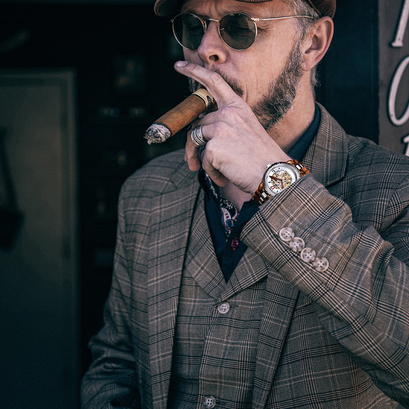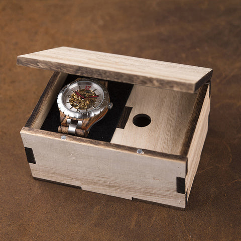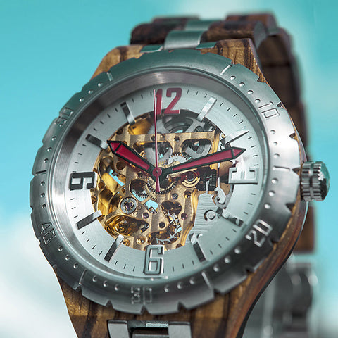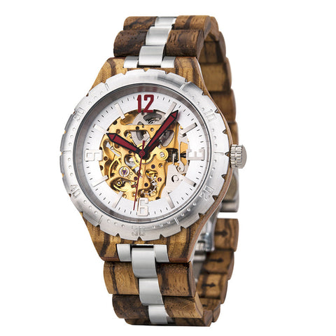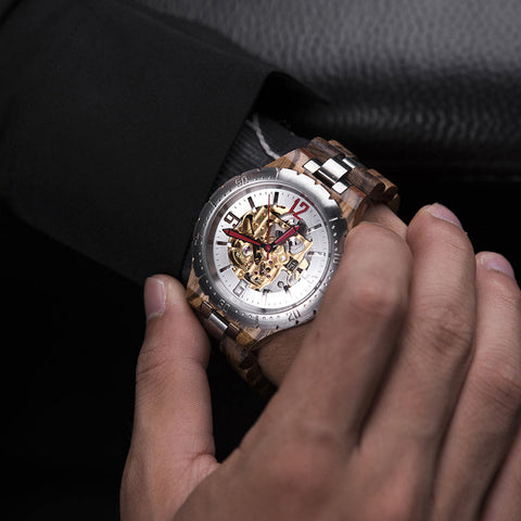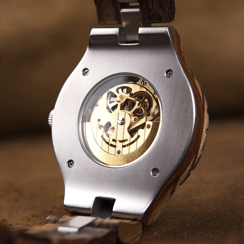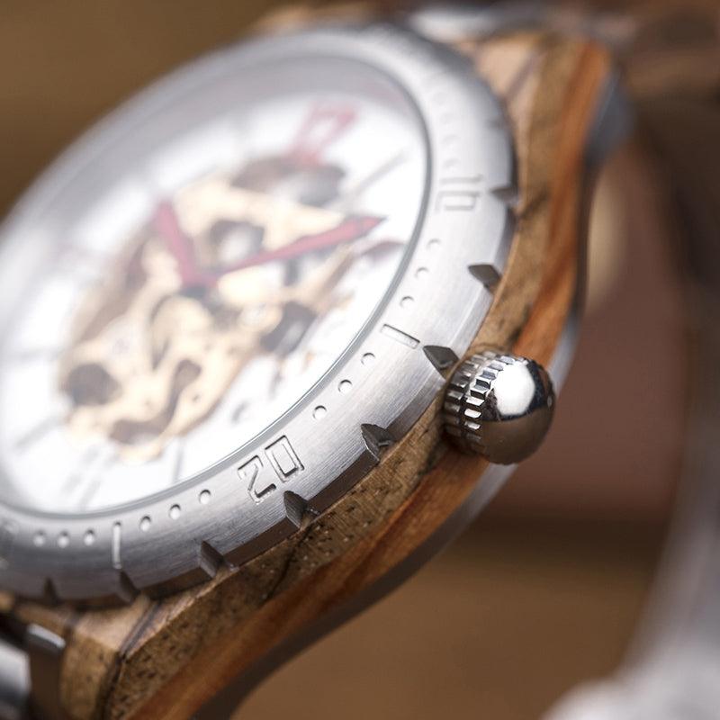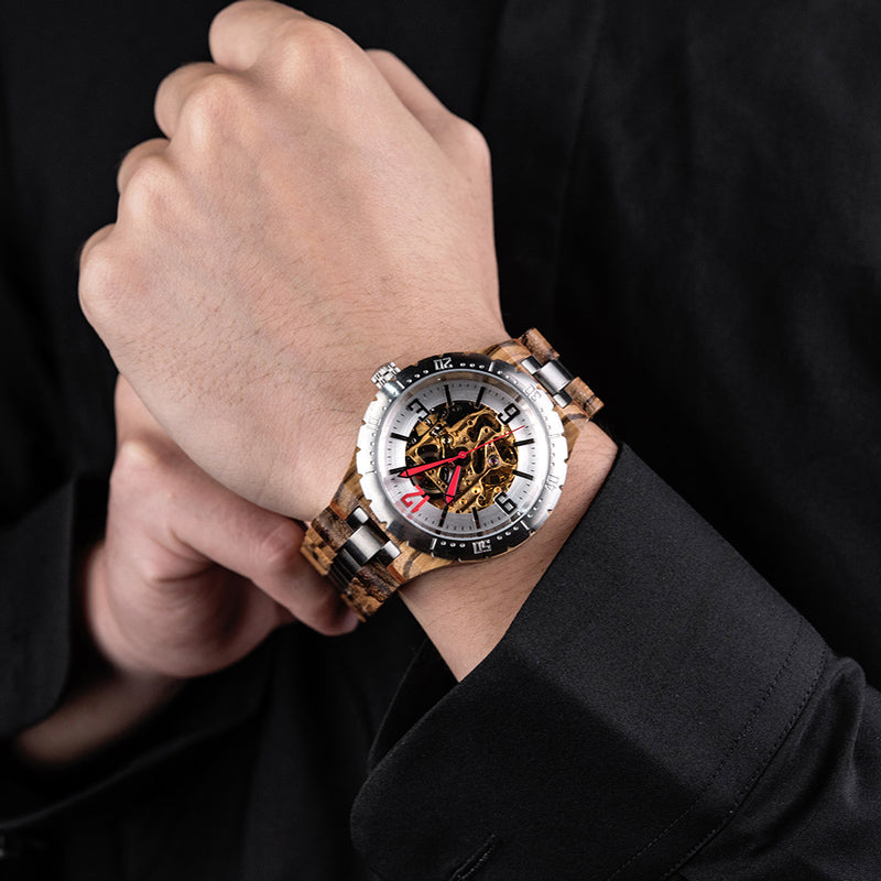 Este relógio de madeira destaca-se pelo seu design e funcionalidade de luxo. Possui um movimento mecânico e um mostrador esqueleto que revela a mecânica interna do relógio, tornando-o um dos nossos modelos mais requintados.