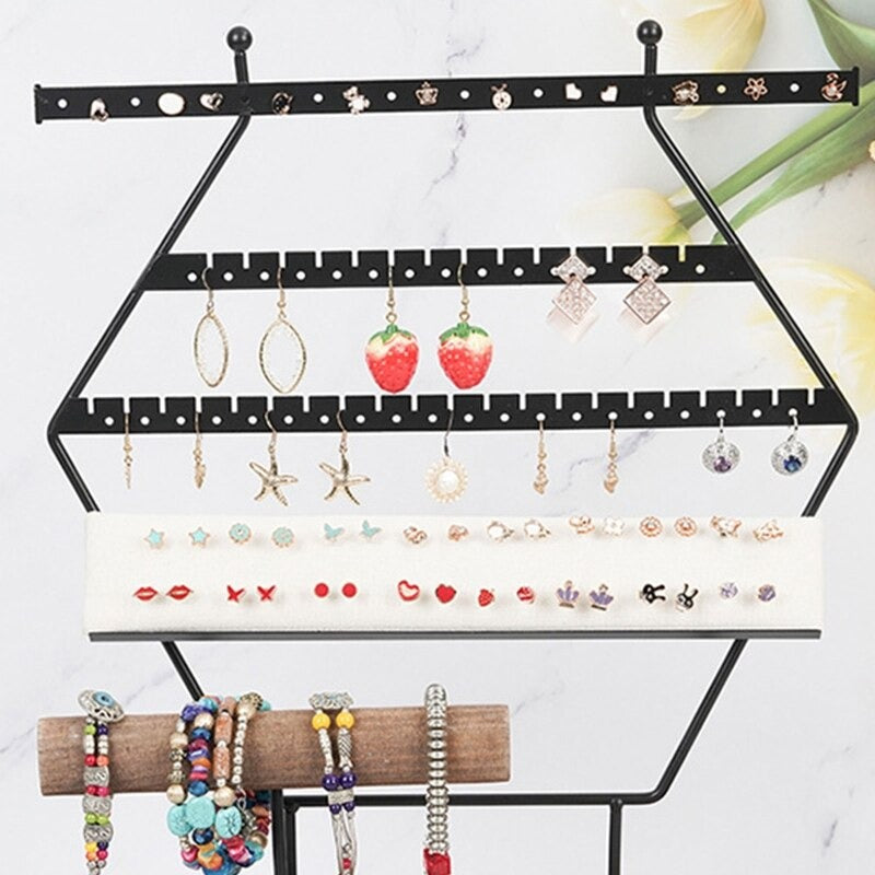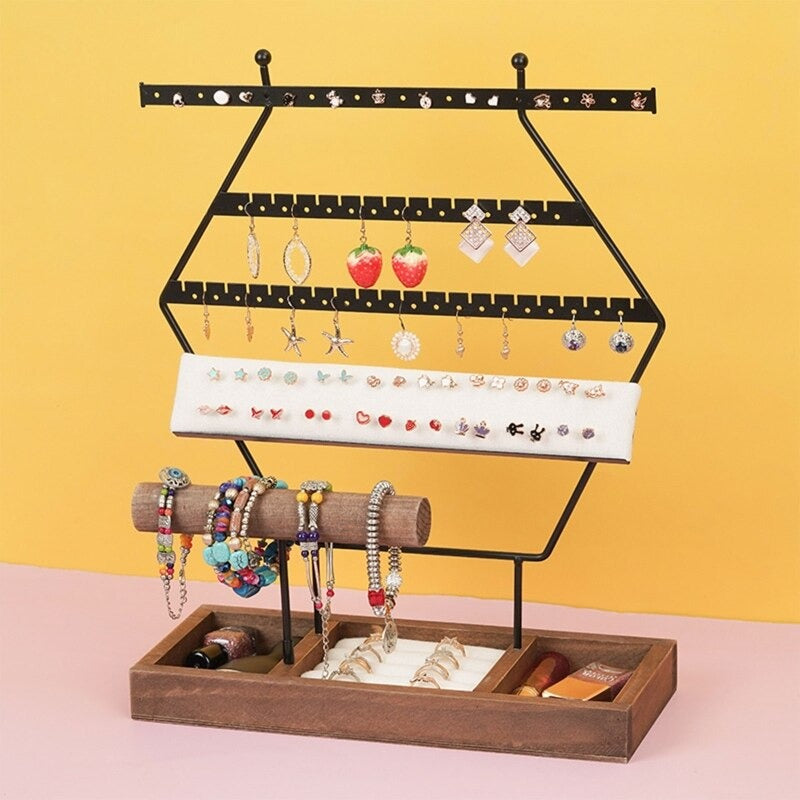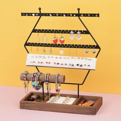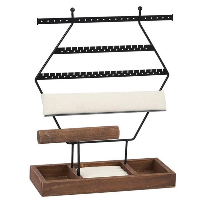 Tem muitos brincos e não sabe como organizá-los? Com este grande suporte metálico para brincos, pode pendurar tanto brincos suspensos como brincos de botão, graças ao suporte de espuma incluído. Este organizador de joias também inclui um suporte de madeira para pulseiras, dois compartimentos para maquilhagem e um suporte para anéis.