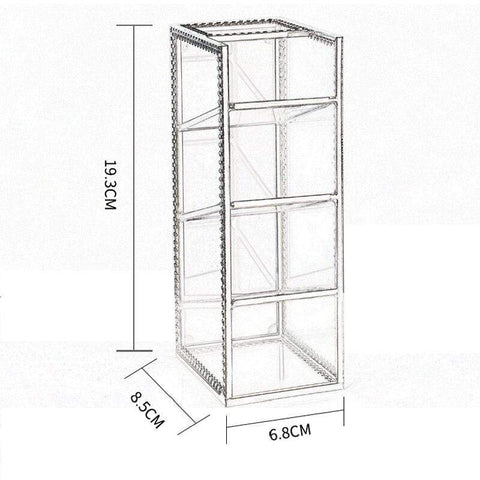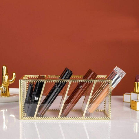 Este suporte vertical para maquilhagem tem a característica única de poder ser colocado na vertical, mas também pode ser disposto na horizontal, permitindo armazenar os produtos de maquilhagem em diferentes compartimentos. Os vários compartimentos são ligeiramente inclinados para proporcionar uma ergonomia ideal para guardar batons.